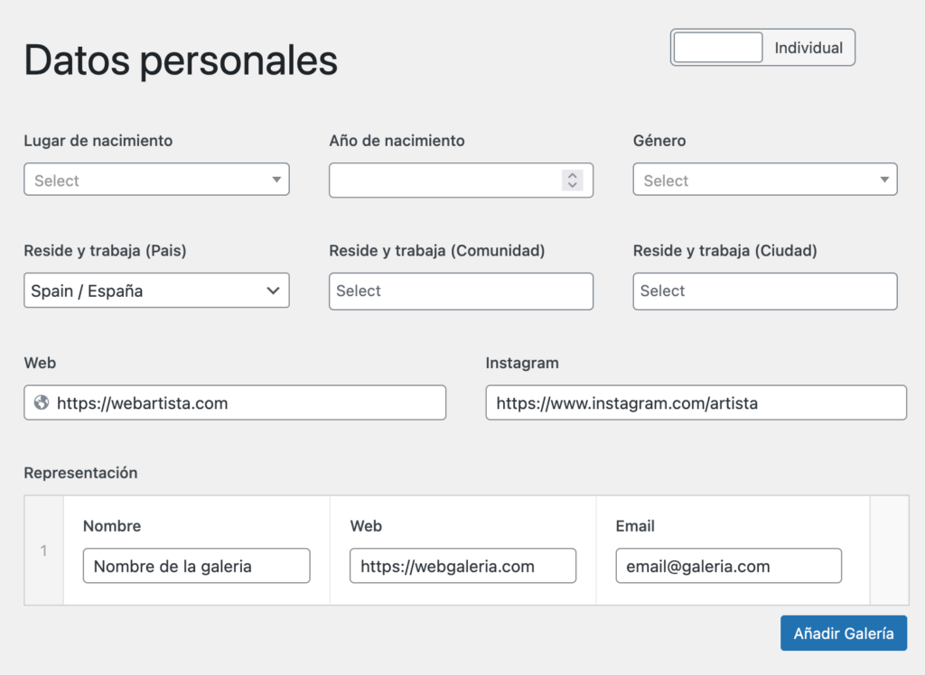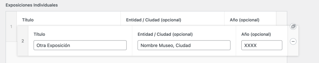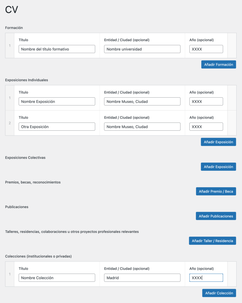 Algunas secciones de tu ficha funcionan como listas editables (proyectos, exposiciones, formación, publicaciones, etc.).